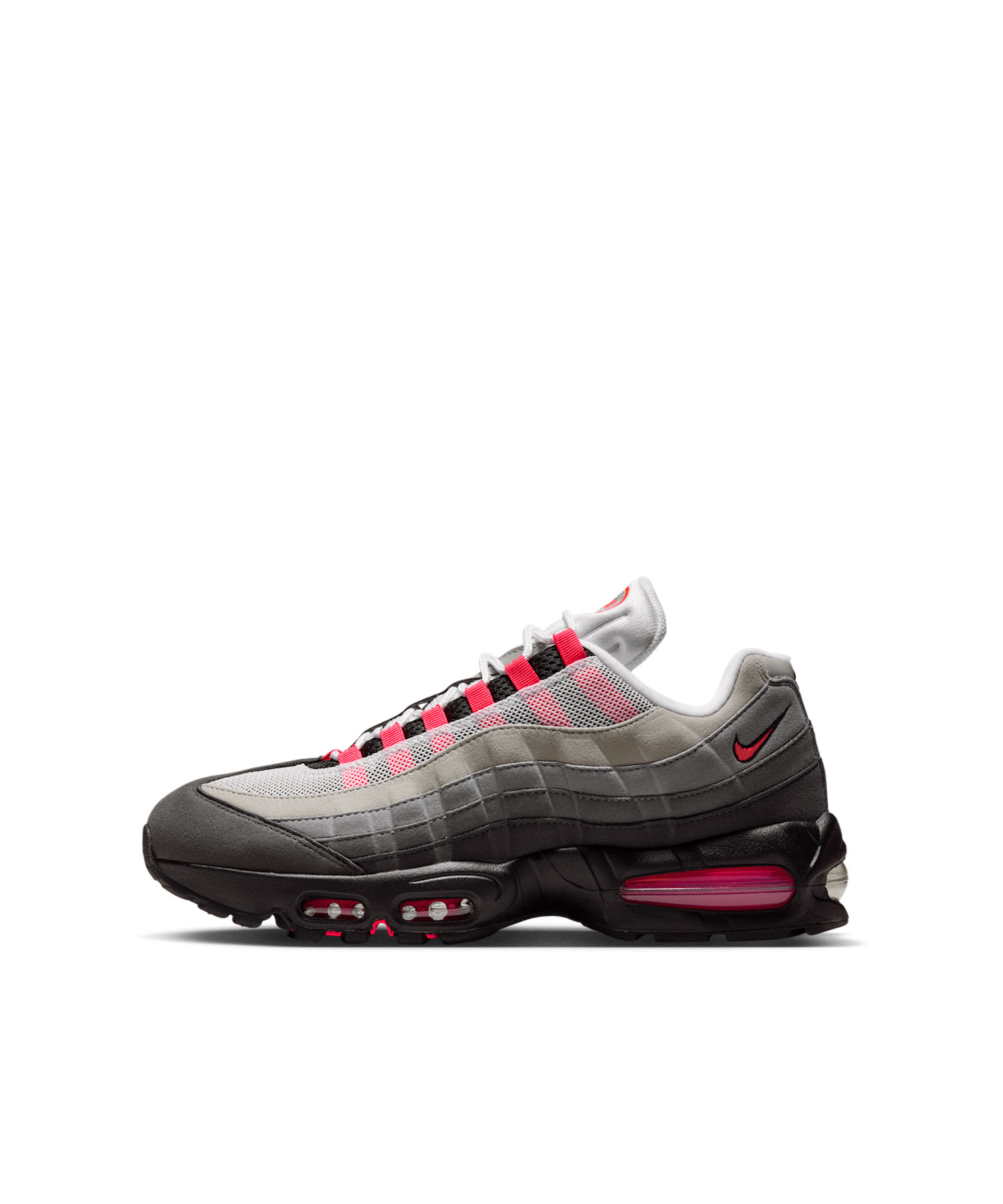 ビッグで大胆なデザインと優れた反発力。アイコニックなシューズの生誕30周年を記念して、Air Maxシリーズからエア マックス 95の「ビッグバブル」エディションが復活する。オリジナルデザインを忠実に継承したこのバージョンでは、合成皮革と風通しの良いメッシュを波状に重ねたアッパーに、ブラックからミディアムアッシュへと変わるグラデーションカラーを使用。シューレースループ、ロゴ、Airユニットを引き立てるのは、ソーラーレッドのアクセント。いつもより足元にAirをプラスして、コーデをレベルアップ。Air Maxと歩むこれからの道のりを楽しもう。