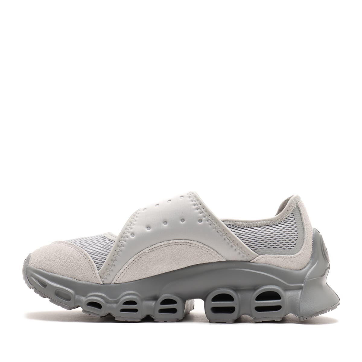 2000年代を代表するランニングシューズ、a3 Megarideにインスパイアされたこのシューズは、アーカイブモデルのトンネル状の穴と、とびきり快適なFOMを使用した新技術のミッドソールを合わせている。Mary Janeからインスピレーションを得たシルエットに、面ファスナー式ストラップを装備し、脱ぎ履きしやすい。また、通気性に優れたクローズドメッシュ構造を採用。