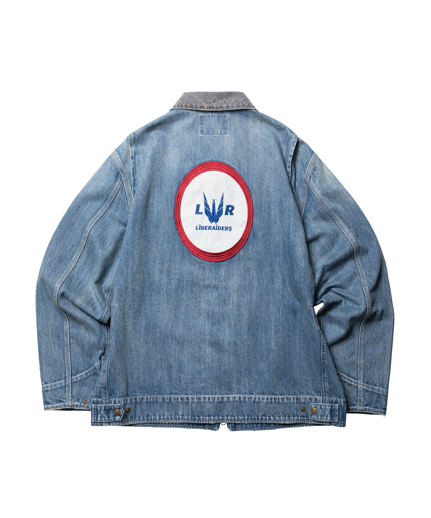 程よいスラブ感の 11oz のデニムを使用したワークジャケット。 衿には春夏シーズンに適したライトなシャツコールを採用しています。 左胸、背面には架空の航空会社【LIBERAIDERS AIR】のワッペンが付きます。右胸には缶バッジが付きます。