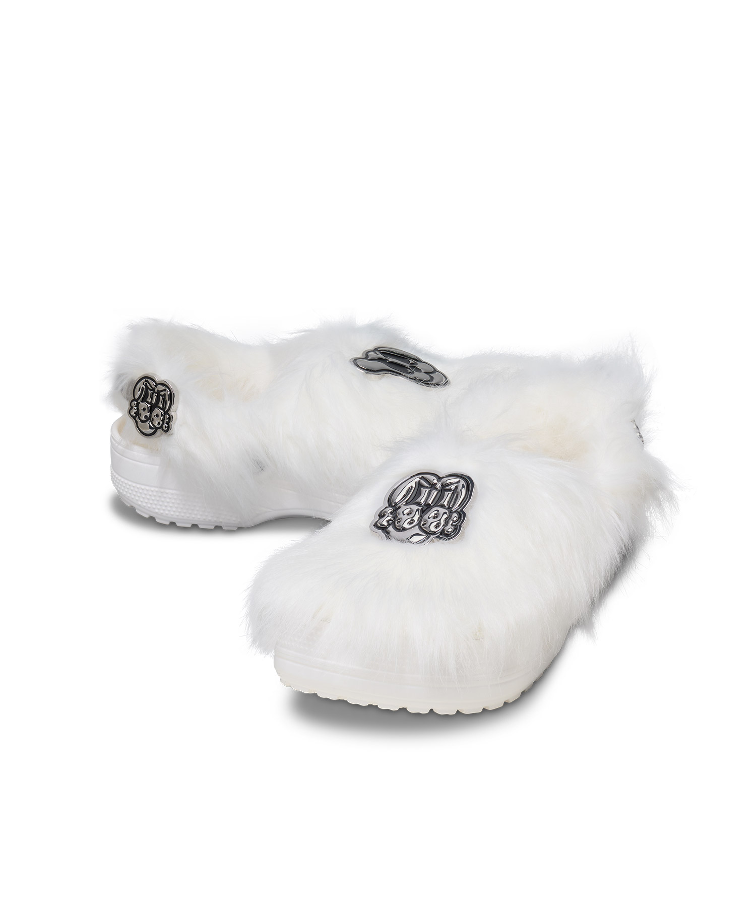 CHITOは、過去10年間にわたる自身の台頭と成功を支えてきた愛犬たちへのオマージュを込め、その生々しく飾らないアプローチをフットウェアの世界にもたらします。「Classic Crafted Clog」にフェイクファーアッパーを採用し、アニマルな雰囲気を醸し出しています。左足には「Finesse pup」、右足には「Lookout Pup」のロゴが施されています。ヒールストラップにはJibbitz™チャームを付けて自分好みにカスタマイズでき、金属プレートにはアーティストの名前が刻印されています。